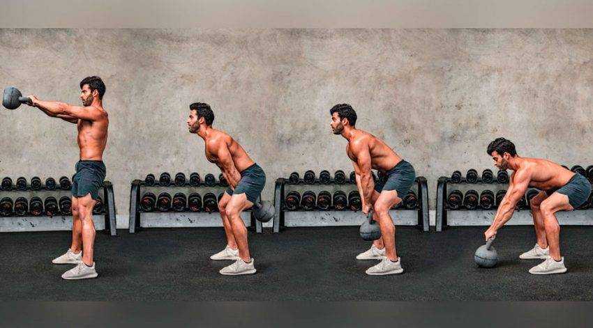 - В верхней точке зафиксируйтесь на секунду и начинайте опускание. На пол ставить не нужно – делайте замах назад и снова подъем.