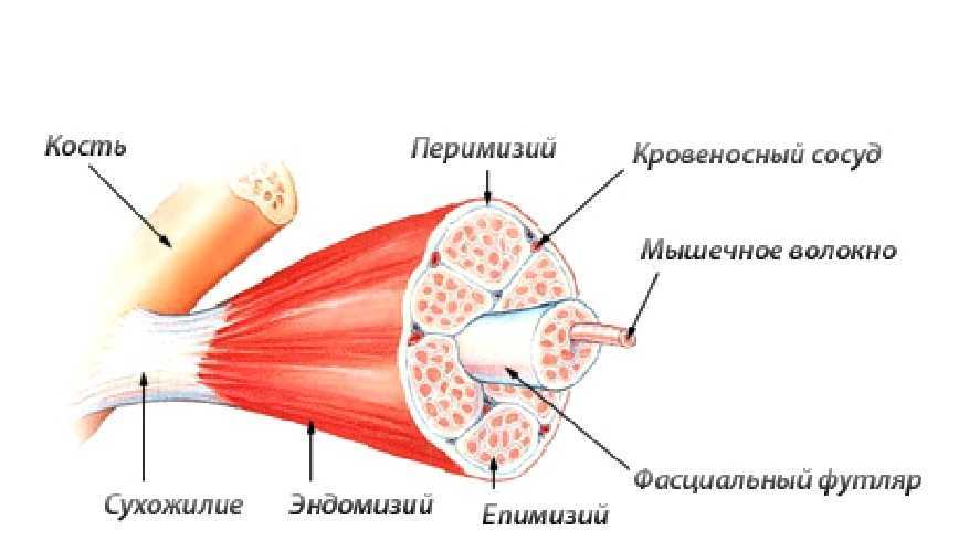 Мышечная ткань — это сложная структура, состоящая из пучков длинных вытянутых клеток (которые называются волокнами). Они обернуты плотной соединительной тканью — перимизий. Вот так это выглядит: