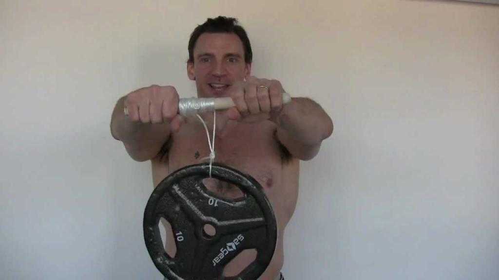 Существует еще одна оригинальная методика, которая позволит разобраться, как накачать предплечья. Речь идет о накручивании веревки с грузом. Тренировка способствует напряжению широкого ряда мелких мышц в целевой области. В качестве инвентаря следует использовать прямую палку и отягощение в виде блина от штанги. Груз привяжите к концу прочной тонкой веревки. Второе окончание надежно зафиксируйте на палке.