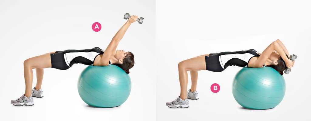 Лежите на фитнес мяче или скамейке, расширяя обе руки над головой с гантелями в каждой руке. (A) Согните локти так, чтобы предплечья были параллельны полу. (Б) Медленно выпрямите руки, затем опустите их в исходное положение.
