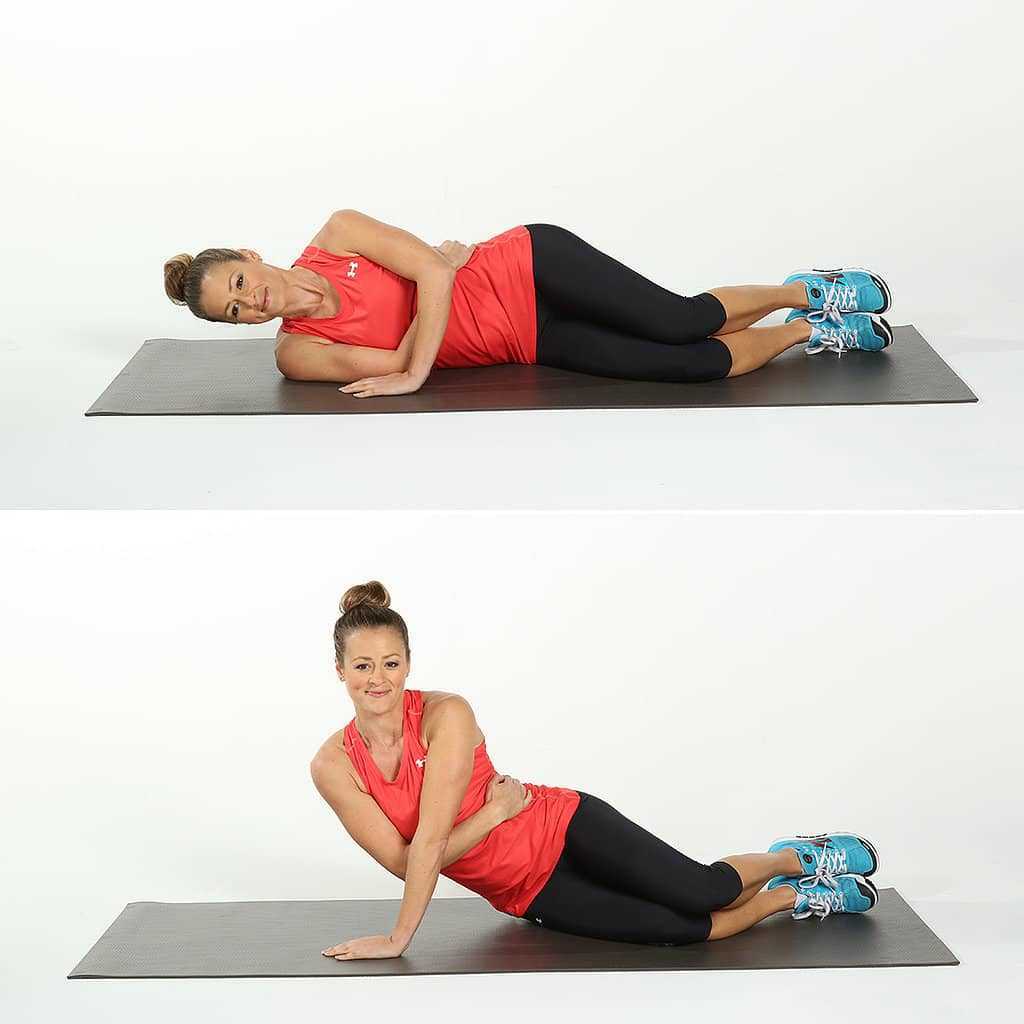 Боковые. Лягте на бок, ноги немного подогните, нижнюю руку положите на верхнее плечо. Упритесь свободной ладонью в пол и поднимите корпус вверх. Контролируйте, чтобы спина была ровной, а взгляд устремлен прямо перед собой.