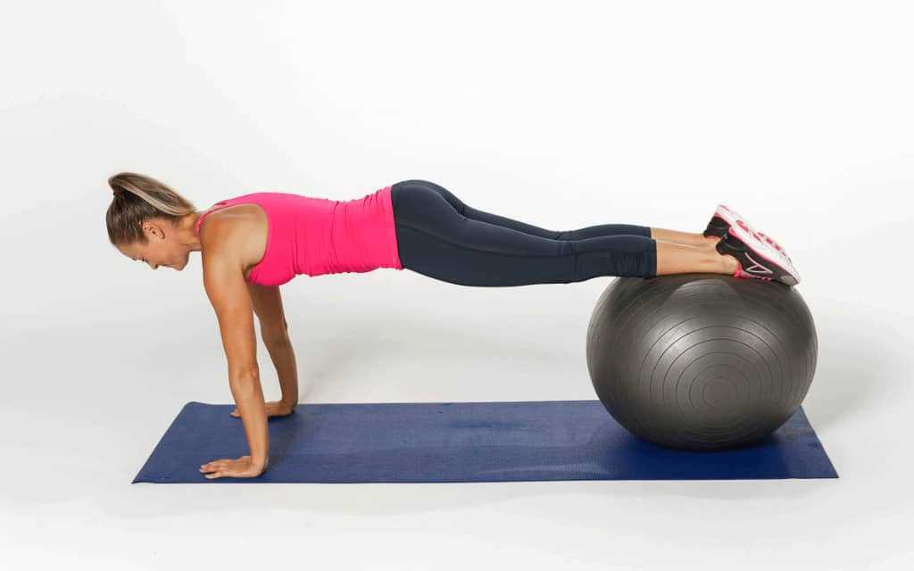 (A) Примите положение для отжимания от пола, только поместив ноги на фитнес мяч. Руки поставьте немного ближе, чем на ширину плеч.