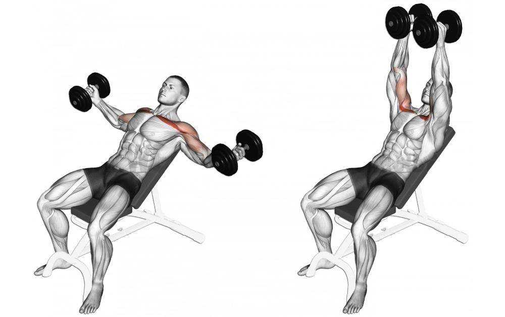 Это упражнение особенно напрягает верхнюю часть грудных. Делаем его так же, как и обычный жим, но здесь ставим скамейку под углом в 15-30 градусов. Более крутой угол использовать не надо. Это только сократит количество нагрузки, выполняемой грудными, и увеличит активацию плеч.