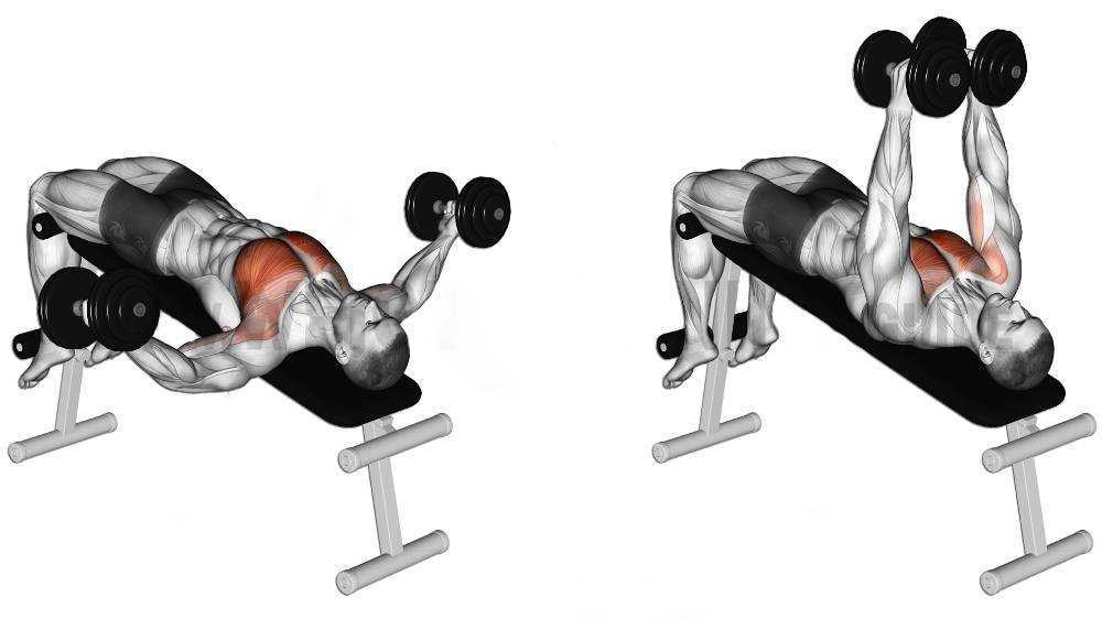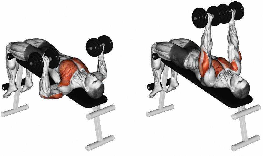 - Ложимся на скамью, удерживая гантели. Поднимаем их вверх, пока руки не будут полностью вытянуты. Поворачиваем их так, чтобы ладони были направлены внутрь. Немного сгибаем в локтях и держим их так на протяжении всего упражнения.