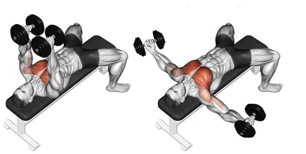 Жим лежа качает трицепсы и грудь. Разведения отличаются от них тем, что почти не используют трицепсы, так как руки не сгибаются на протяжении всего упражнения. Это значит что вам придется использовать меньше веса чем в жиме, но большая часть работы будет выполняться грудью.