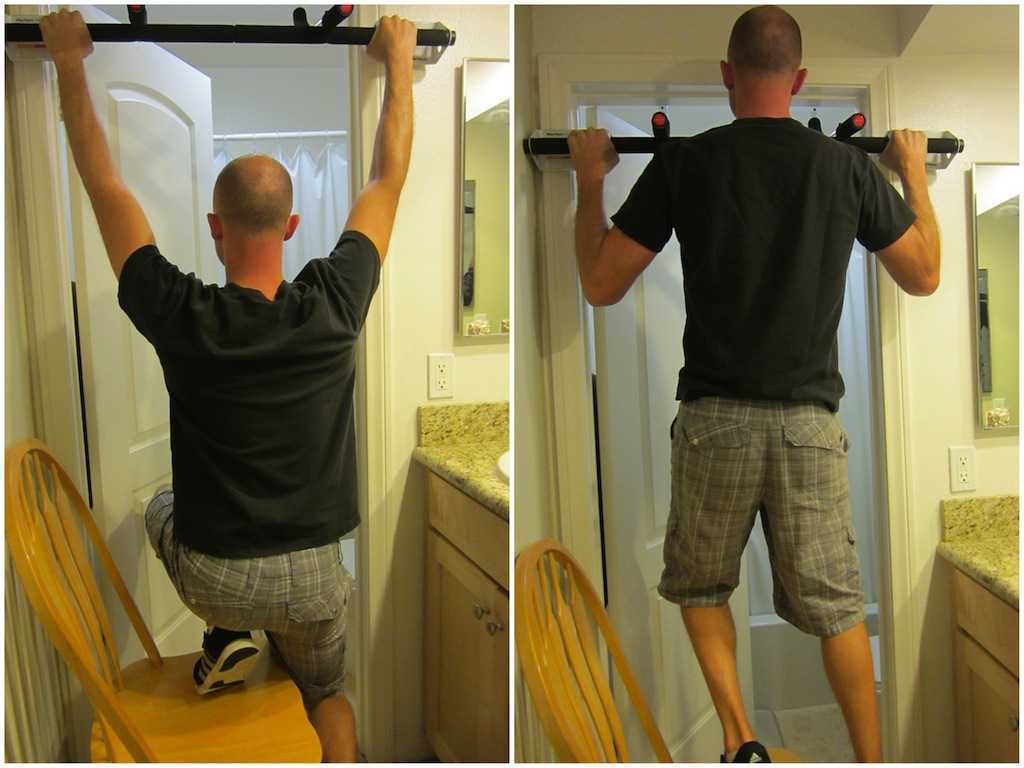 В данном случае техника выполнения подтягивания на перекладине по своей сути напоминает предыдущее, только в качестве опоры используется невысокий стул.