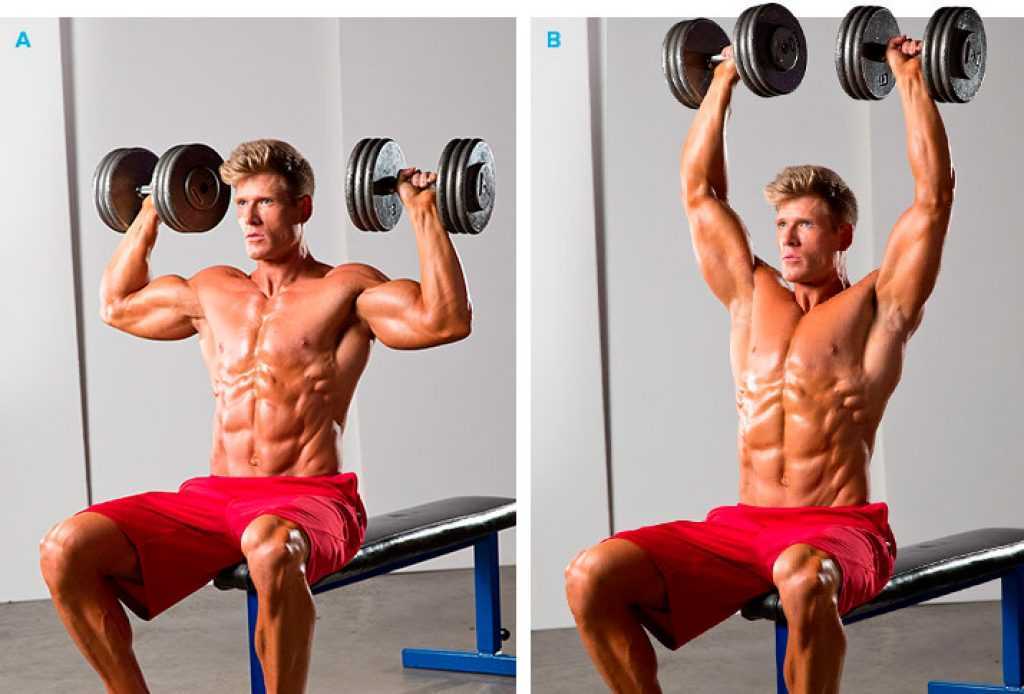 Жим гантелей сидя — лучшее упражнение для развития плеч. Задействует переднюю и среднюю головки дельтовидных мышц. |