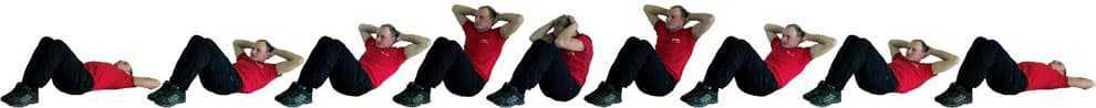 Лежа на спине с согнутыми ногами (руки за голову, пальцы в «замок», ноги согнуты, ступни прижаты к полу, лопатки касаются пола), наклонить туловище вперед до касания локтями коленей и возвратиться в положение лежа на спине с согнутыми ногами. При выполнении упражнения ступни фиксируются.