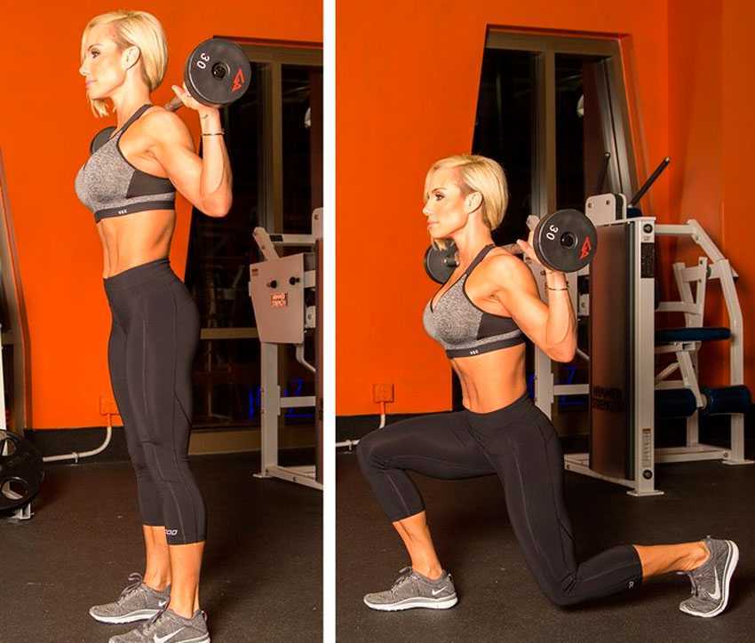 - Выпады с гантелями — три сета при 8–10 повторах в каждом.