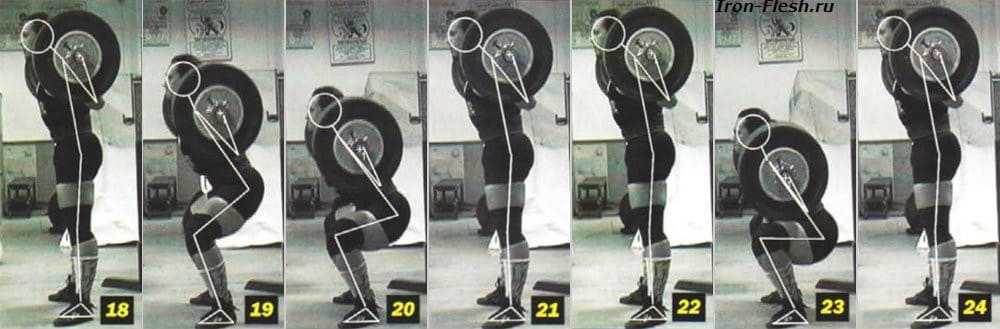 - Атлет должен самостоятельно вернуться в вертикальное положение с полностью выпрямленными в коленях ногами. Двойное вставание (подскакивание) из нижнего положения приседа или любое движение вниз запрещены. Когда атлет, завершив движение, примет неподвижное положение, старший судья должен дать сигнал вернуть штангу на стойки.