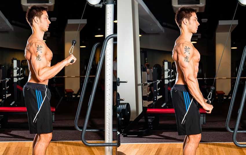 - Вдохнув, равномерным усилием трицепсов уводят рукоять к низу до полного распрямления рук. Самый сложный отрезок движения делается на выдохе. Двигаться должны лишь предплечья.