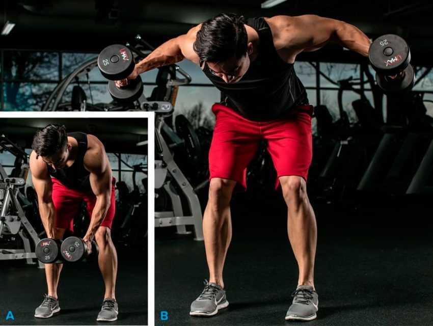 Махи гантелями в стороны в наклоне (на заднюю дельту)