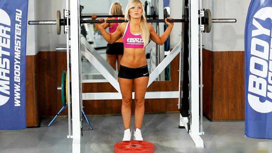 А вот эта версия для людей, у которых отсутствует специальный тренажер для прокачки икроножных. Работая в Смите, мы можем не переживать об устойчивости. Так как штанга в нем закреплена и движется только по заданному вектору. Для того, чтобы получить максимальный результат, нужно что-то подложить под ноги. Но степ-платформа уже не подойдет. Она слишком высокая. А диапазон движения грифа в Смите не даст нам полностью выпрямиться. Поэтому лучше использовать плинты. В основном их подкладывают под штангу для выполнения СТАНОВОЙ ТЯГИ. Если же их нет, тогда используйте блины.