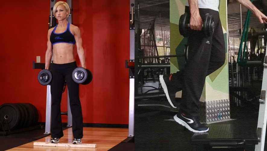 Данный вариант можно выполнять как двумя ногами сразу, так и каждой по отдельности. В отличие от тренажера, мы держим отягощение в опущенных руках. Следовательно, нагрузка на позвоночник уменьшается. Но стоит понимать, что не каждый сможет долго удерживать тяжелые гантели. Поэтому увеличивать рабочий вес в данном варианте гораздо проблематично. Зато мы можем уменьшить дисбаланс в развитии каждой из мышц голени. И придать им более рельефный вид. Для того, чтобы получить максимальный результат, нам надо встать на какую-то возвышенность. Для этого, отлично подойдет степ-платформа. Делается это для того, чтобы мы могли опускать пятки ниже параллели с полом, и максимально растягивать мышцы.