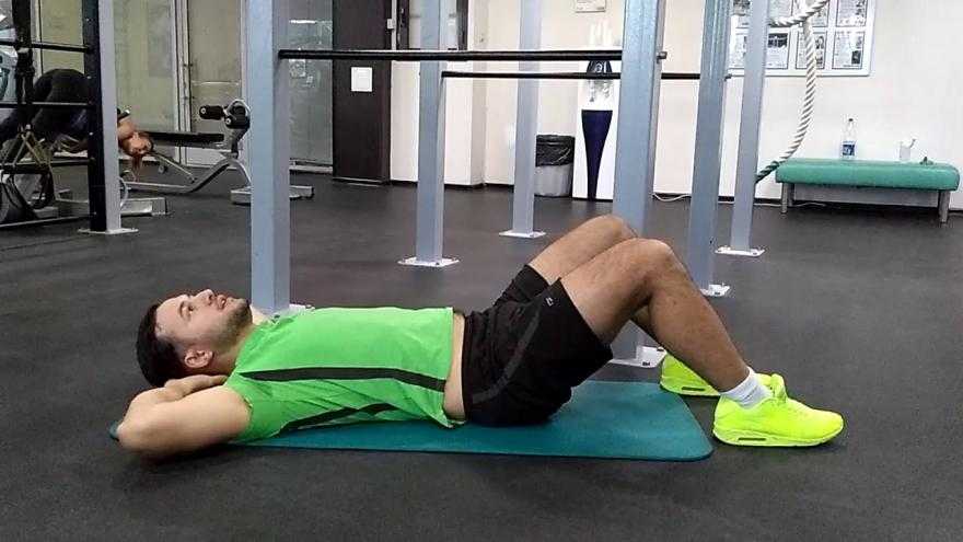 - Лечь спиной на тренажер, ладони положить на затылок.