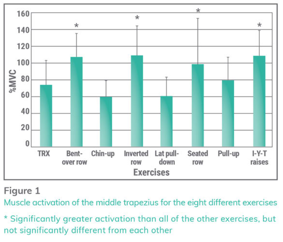 1. Середина трапеций (см. Middle Trapezius на картинке выше в этой статье): Больше всего рекрутировали 4 упражнения – тяга в наклоне (bent-over row), подтягивание на низкой перекладине (inverted row), тяга нижнего блок (seated row) и IYT-подъемы.