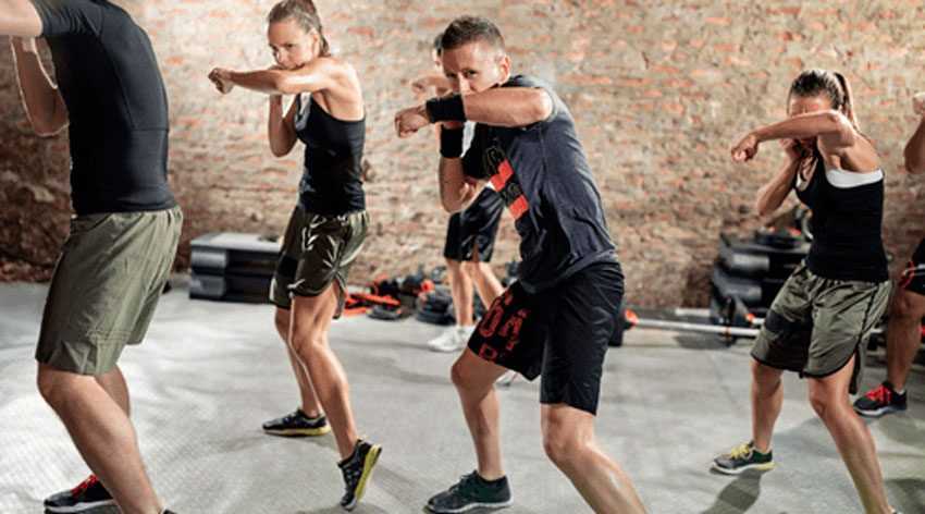 | Содержит достаточно много простых аэробных шагов – из стороны в сторону, грейпвайн, шаги вперед-назад | Полностью построен на боксерской работе ногами, перепрыжки вперед-назад |
