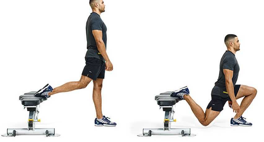 - Встаньте спиной к платформе или стулу высотой до колен. Согните одну ногу и положите ступню на платформу позади вас. Отпрыгните вперед на одной ноге и опуститесь в подсед в позу «ножницы».