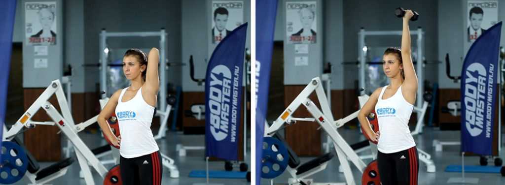 Жим гантели из-за головы одной рукой. Выполняется стоя, спина прямая, гантель за головой, свободная рука на поясе. Поднимайте гантелью вверх, выравнивая локтевой сустав. Работает исключительно предплечье, а плечо зафиксировано.