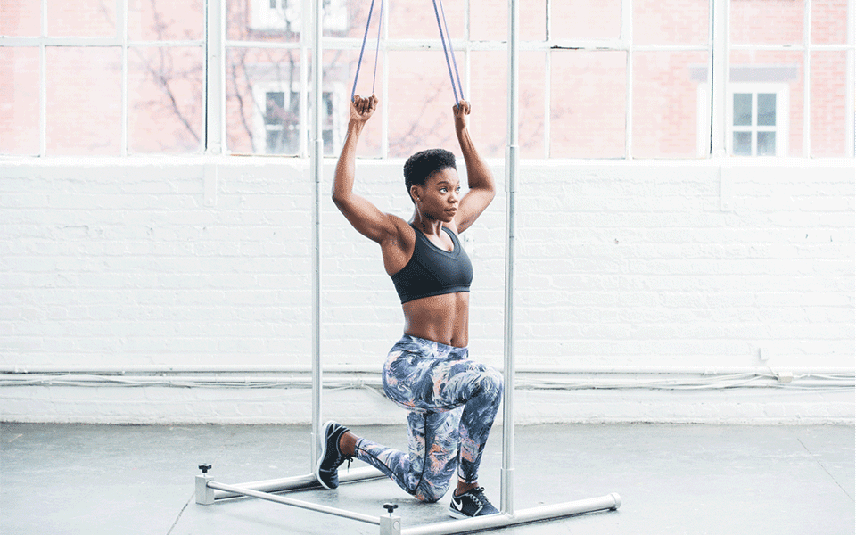- Выпады. Закрепляем экспандер на уровне бедер. Натягиваем резину, держа согнув в локтях руки на уровне талии, ладонями вверх. Делаем один шаг левой ногой вперед с выпадом, одновременно вытягивая правую ногу. Возвращаемся в исходное положение. Повторяем упражнение 12-15 раз по 3 подхода.