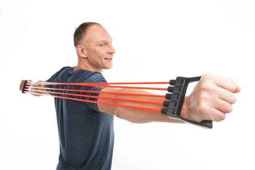 Для этого понадобятся различный спортивный инвентарь (гантели, утяжелители и прочие тренажеры). Однако, это все может заменить обыкновенный резиновый эспандер.