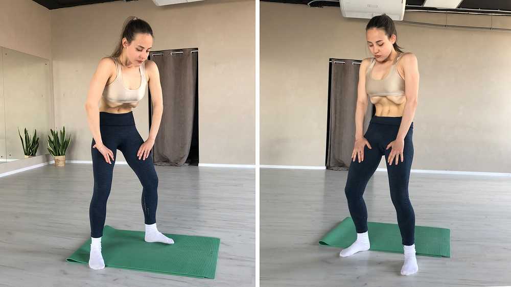 - Чтобы упростить выполнение упражнения, упрись руками в бедра на 10 см выше коленей. При этом немного округли спину.