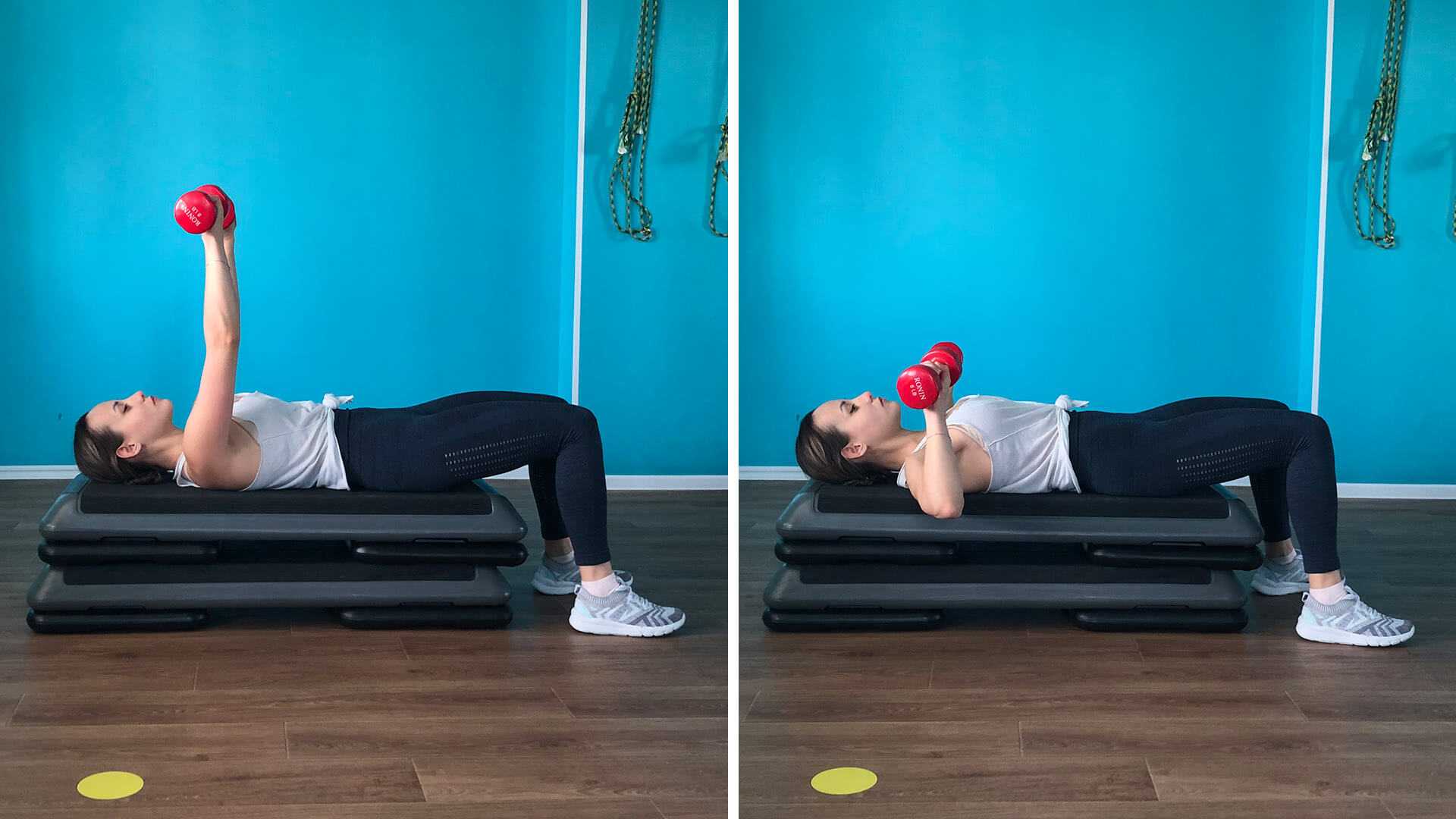 - Лягте на спину, поставив стопы ближе к тазу. Руки расположите вдоль туловища или удерживайте отягощение.