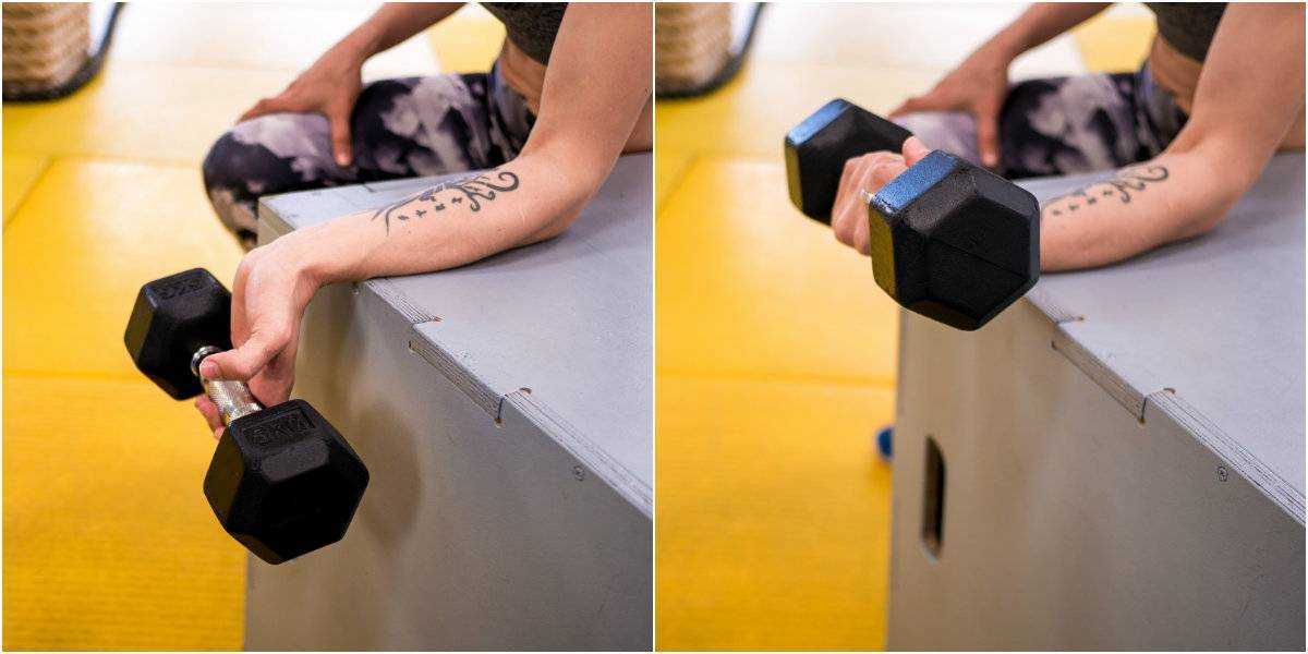 - Обратные (реверсные) сгибания запястья. Сядьте, взяв гантель в руку, запястье распрямите, а затем согните. Следите за тем, чтобы ладонь была обращена вниз, а локти не отрывались от бедер. Выполните 3 захода по 20 сгибаний.