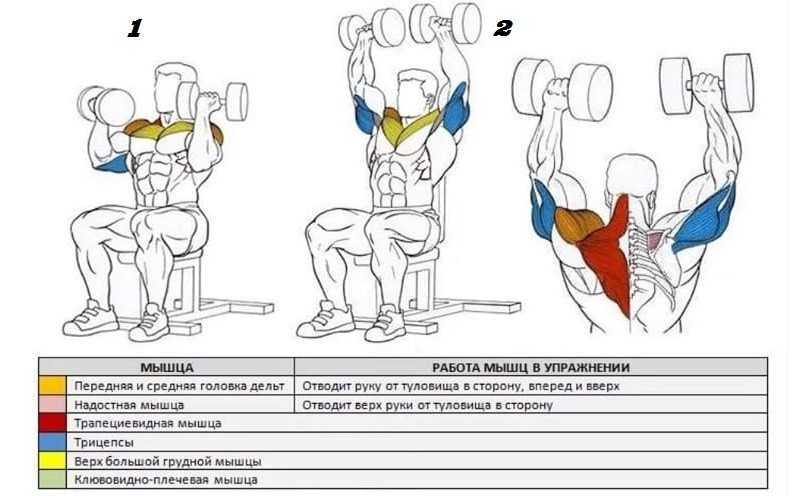| Классический вариант жима гантелей сидя | Подходит для спортсменов и женщин, и мужчин; отличается несложной техникой |