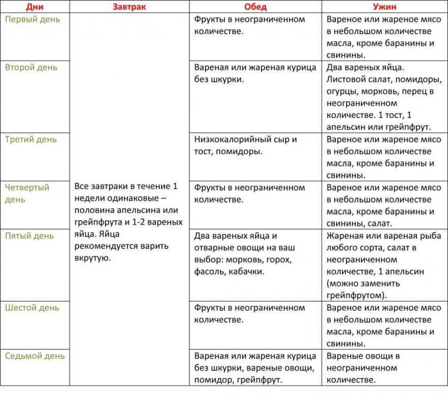 | Воскресенье | Отварные овощи и куриная грудка в любом количестве, 1 грейпфрут | Меню обеда, грейпфрут можно заменить апельсином |
