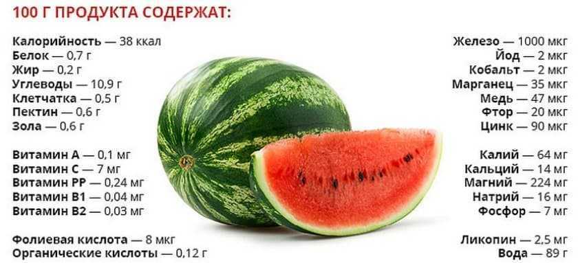 В 100 г продукта всего 27 ккал. Арбуз содержит: