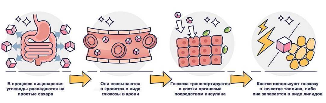Основное расщепление углеводов происходит в кишечнике — в его тонком отделе. Там сложные соединения (полисахариды) расщепляются до простых (моносахариды) и доставляются кровотоком к нуждающимся органам и тканям.