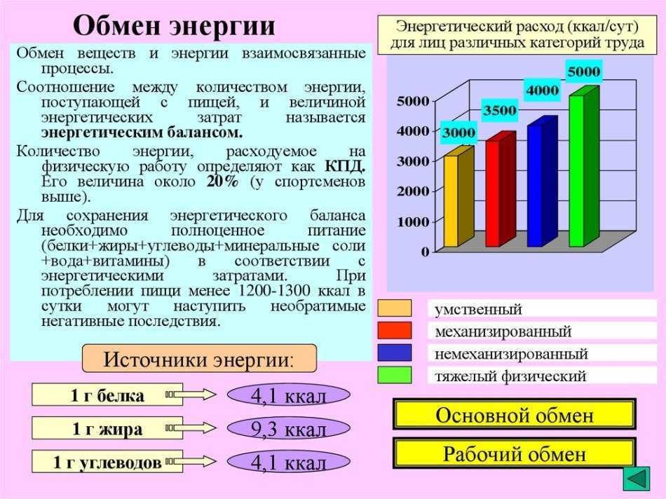 Мы постоянно затрачиваем определенное количество энергии: на движение, дыхание, разговоры, мышление и даже на сон. Чем более активный образ жизни ведется, тем больше энергии затрачивается. Взамен израсходованной энергии в организм обязательно должна поступить новая, и её количество должно соответствовать затратам.