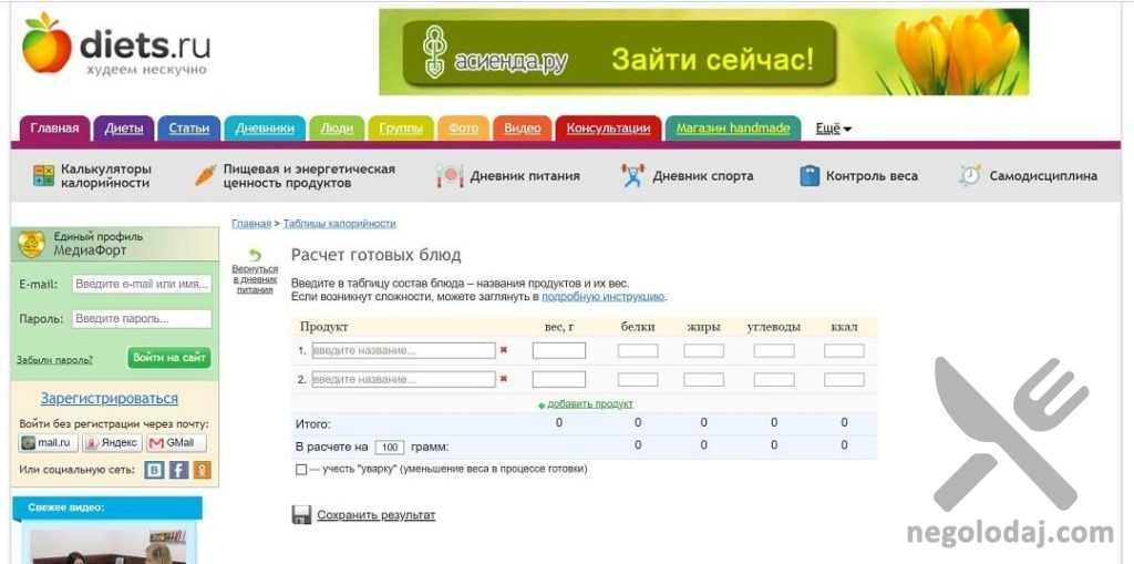 Второй ресурс, который также позволяет бесплатно узнать калорийность и БЖУ готовых продуктов, при этом учитывая “уварку” — Diets.ru. Нас интересует калькулятор под названием “Расчет готовых блюд”.