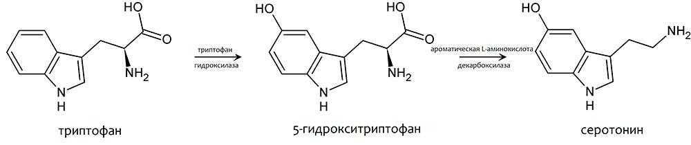Основной путь метаболизма аминокислоты – серотониновый. Преобразование tryptophan → 5-HTP → серотонин происходит не только в нервной ткани, но и в печени, кишечнике. Для успешного протекания реакции требуется присутствие энзима декарбоксилазы и активной коферментной формы витамина В6. Гидрокситриптофан свободно проникает через гематоэнцефалический барьер.