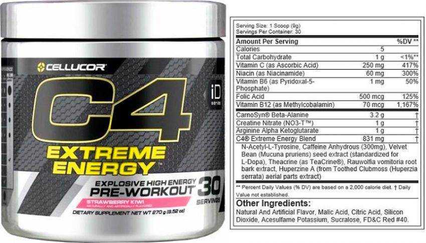 Продукт c4 extreme cellucor хорошо известен своим мощным действием и качественным составом. В него вошли только натуральные и полезные компоненты – аргинин, бета-аланин, витамины, таурин, креатин, ВСАА аминокислоты, окись азота и многие другие. Все это делает предтренировочный комлплекс по-настоящему эффективным.