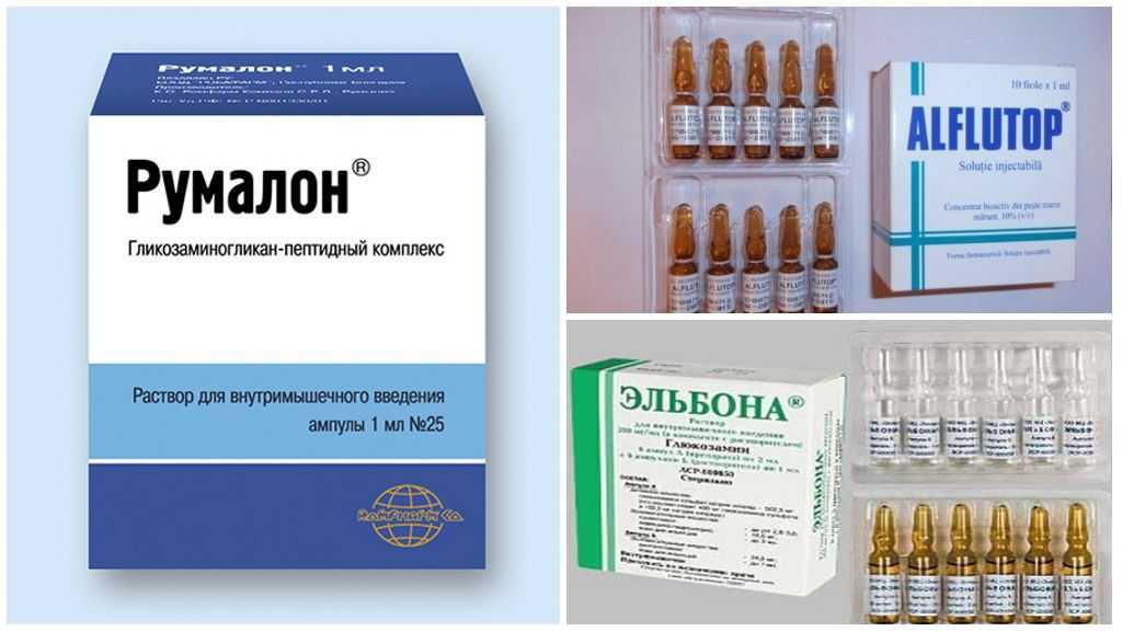 - Раствора для внутримышечных инъекций (Эльбона, Мукосат, Алфлутоп и пр.) – отличаются более высокой эффективностью и назначаются курсами по 10—20 дней, в течение которых ежедневно требуется делать 1 инъекцию. Затем их заменяют средствами для перорального употребления.
