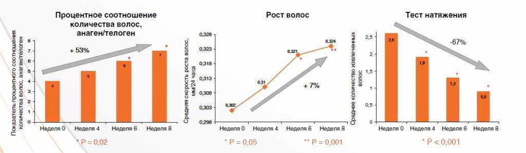 ➜ В течение всего периода исследования наблюдалось увеличение скорости роста волос, на 6-й и 8-й неделях