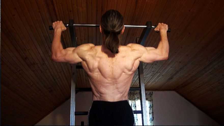 Для спины – становая тяга со штангой весом в 60, 70 и 80 кг, затем по 30 подтягиваний широким и узким захватом, в завершение тяга верхнего блока сначала к груди с весом 60, 65 и 70 кг, потом за голову – 50, 55 и 60 кг.