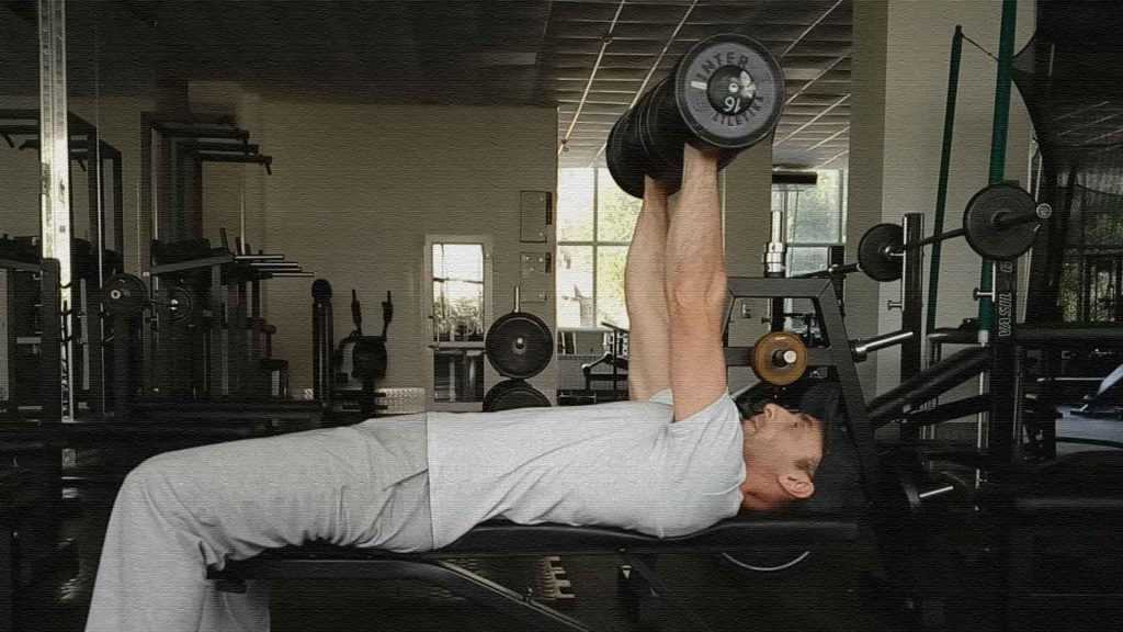 Это мощное упражнение с гантелями для развития мышц груди, трицепсов и дельтовидных мышц.