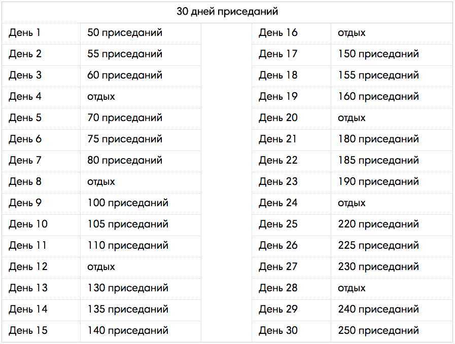 Шестнадцатый день – делаем очередной день отдыха. Семнадцатый – выжмите 150 приседаний. На восемнадцатый день – сделайте 155. Девятнадцатый — присесть 160. Двадцатый – позвоните друзьям и прогуляйтесь. На двадцать первый день – сделайте раз 180. На двадцать шестой программный день — 185 приседаний. На двадцать третий день – сделать 190 приседаний. Двадцать четвертого – просто отдохните. На двадцать пятое — присесть 220 раз – как разряд. Двадцать шестого — приседаем 225 раз. Двадцать седьмой программный день – сделать 230 приседаний. Двадцать восьмого – сходите в кино. Двадцать девятого — сделайте 240.