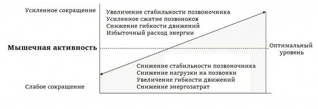 Рисунок 2. Активность мышц кора поддерживается на оптимальном низком уровне. Ее усиление приведет к сжатию позвоночных дисков и расходу лишней энергии. При этом мышечный каркас становится более жестким, в то время как при движении предпочтительнее гибкость.